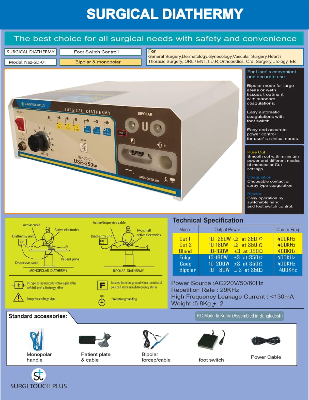 | Model: NAZ-SD-01 Modes: Bipolar and monopolar. Applications: Suitable for general surgery, dermatology, gynecology, vascular surgery, heart/thoracic surgery, ORL/ENT, TUR orthopedics, oral surgery, urology, etc. Functions: Offers precise cutting and coagulation with adjustable power settings. Safety: Features include a foot switch for control and low leakage current. Technical Specs: Output Power: 10-250W (Cut), 10-180W (Blend), 10-150W (Coag), 10-80W (Bipolar). Frequency: 400kHz. Power Source: AC220V/50/60Hz. Weight: 5.8 kg. Accessories: Includes monopolar handle, patient plate & cable, bipolar forceps & cable, foot switch, and power cable. |